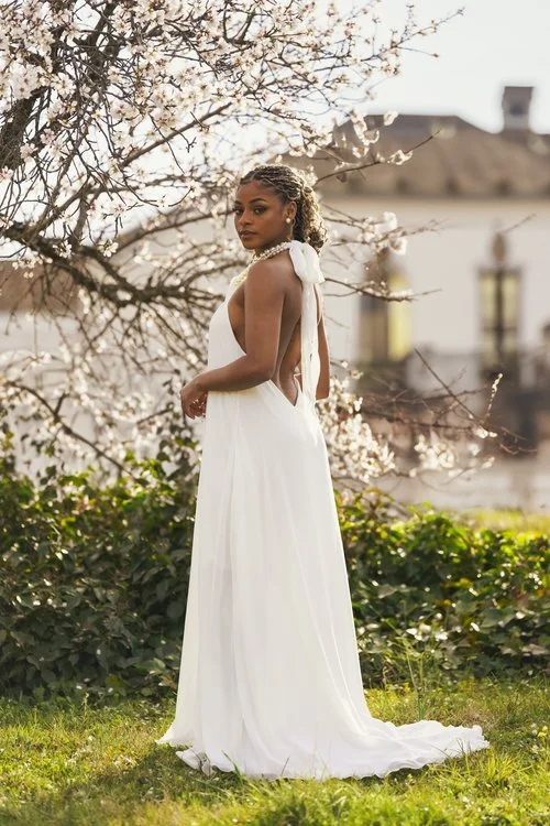 Para las novias que prefieren la sencillez, los diseños minimalistas en crepé, seda y líneas limpias serán una opción estrella. Este tipo de vestidos resaltan la figura sin necesidad de adornos excesivos, logrando un look sofisticado y atemporal.